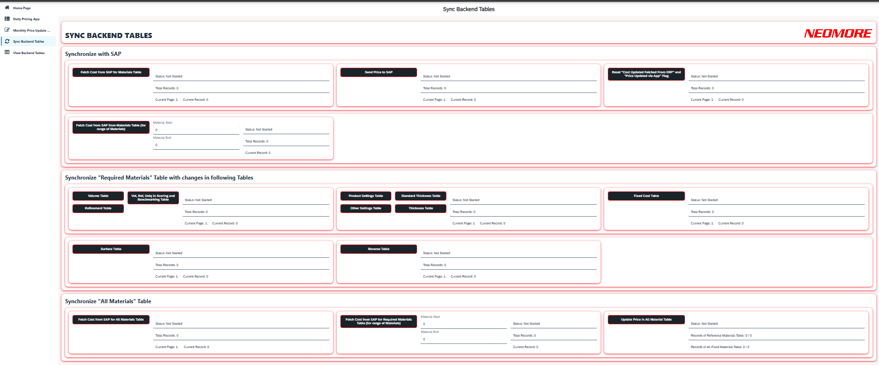 Sync Backend Tables App hakee kustannustiedot SAP ERP ‑järjestelmästä, lähettää uudet hinnat ja myyntikatteet takaisin SAP ERP:iin sekä huolehtii eri taustataulujen synkronoinnista. Toiminnallisuuksiin kuuluu esimerkiksi kustannusten noutaminen vain tarvittuille materiaaleille, päivittyneiden tietueiden kokonaismäärän tarkistaminen ja päivitysten etenemisen seuranta.