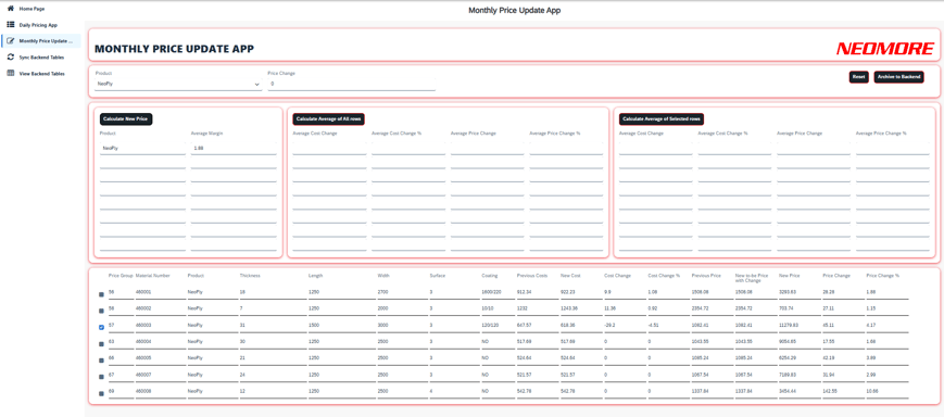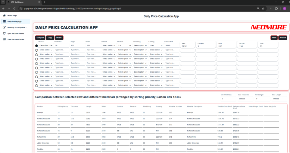 Daily Pricing App laskee päivittäin muuttuvat kustannukset, vertailuhinnan ja myyntikatteen prosenttiosuuden. Sovelluksessa on toimintoja kuten arvojen kopiointi seuraavalle riville, valitun tuotteen vertailu olemassa oleviin materiaaleihin sekä laskentatulosten arkistointi taustajärjestelmään tulevaa käyttöä varten.