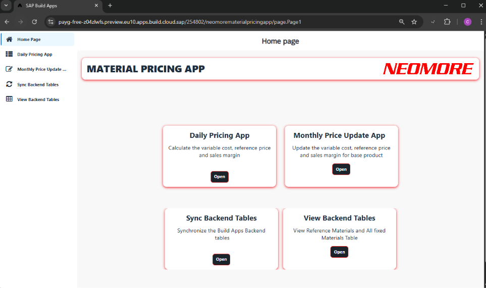 Neomore toimitti integroidun SAP Build Apps ‑ratkaisun SAP BTP:llä, joka keskittää työnkulut ja integroituu suoraan SAP ERP:hen API‑rajapintojen kautta.